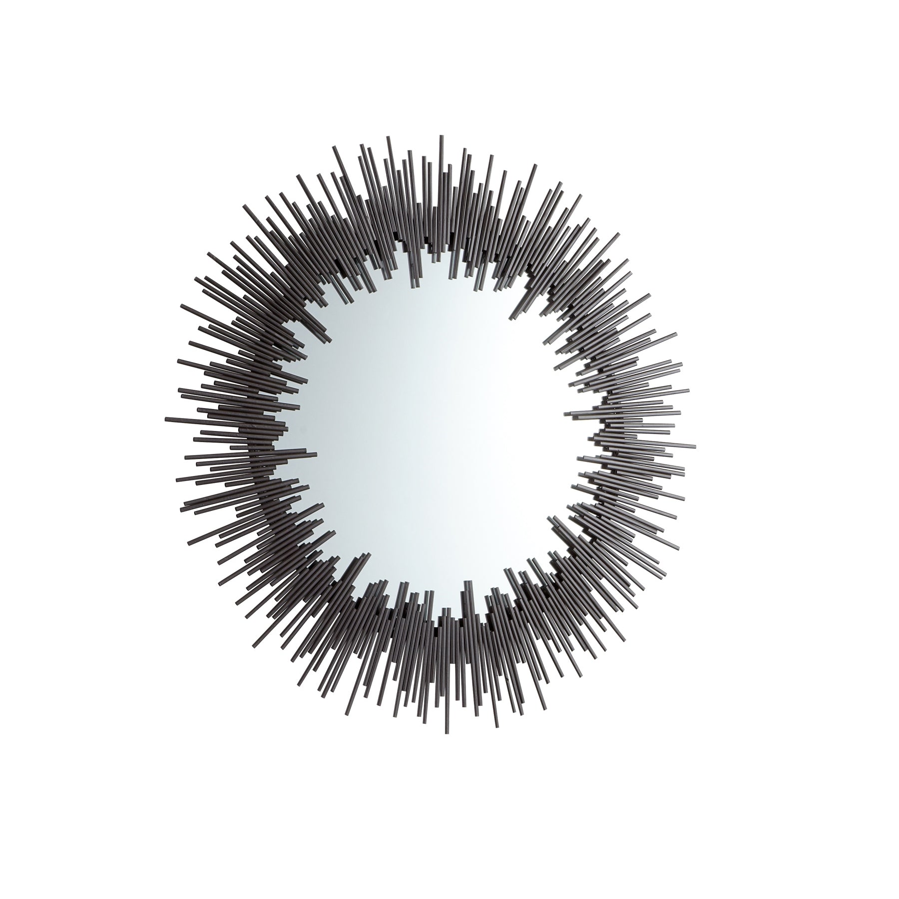Delicate and geometric, this graphite mirror enhances the modern feel in any bedroom. A ring made of thin strips of iron at varied lengths creates a beautiful arrangement, introducing a contemporary twist on reflection.