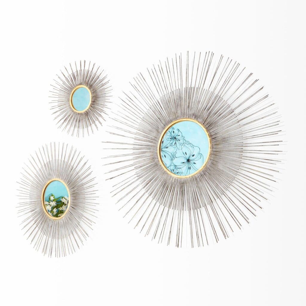 A ring of thin, elongated iron lines emerges from the geometric center of this large antiqued silver leaf mirror. Layers of thin metal bring a delicate touch to any living room.