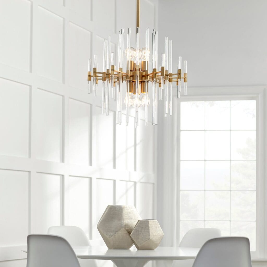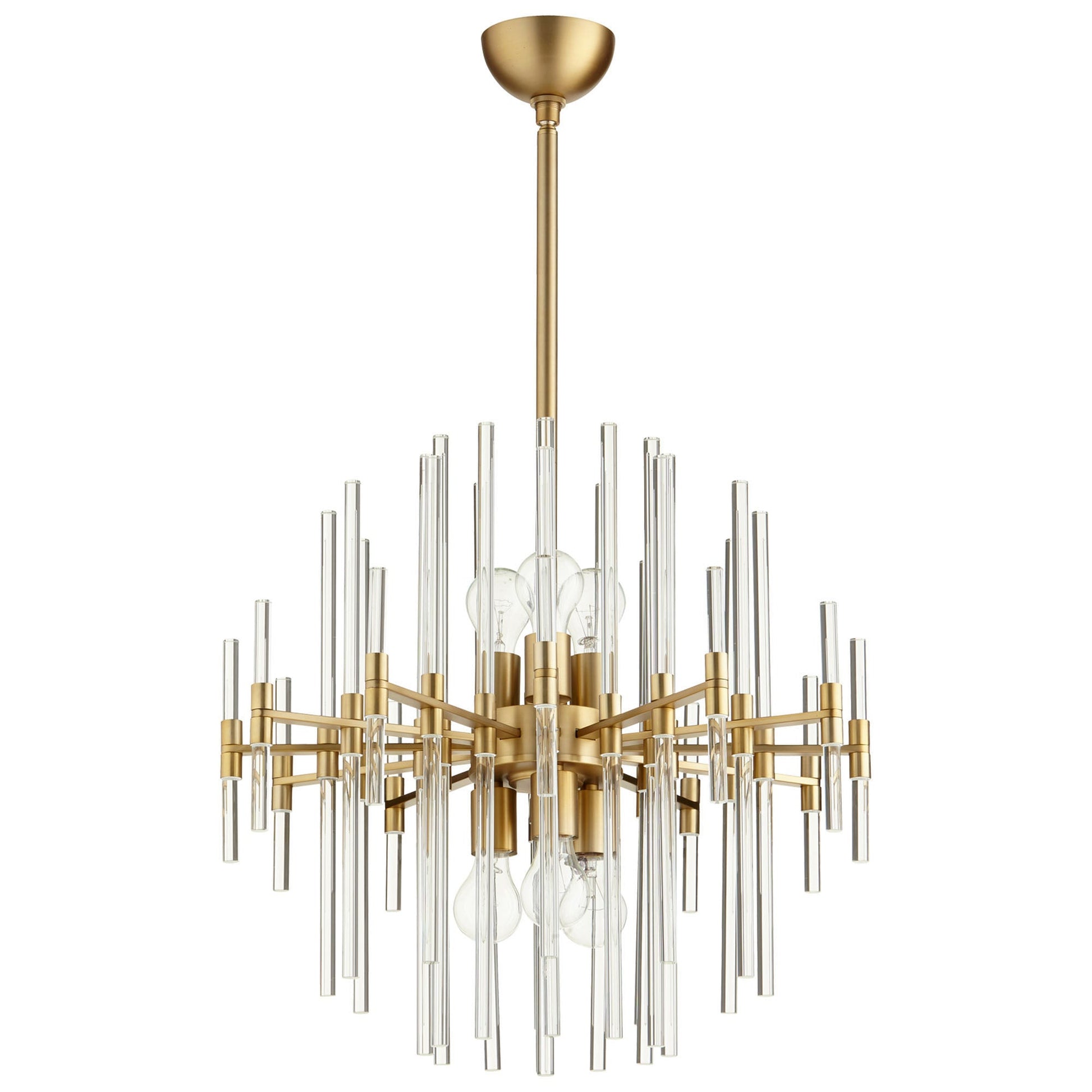 Accent a compact space with the delightful geometric look of this six-light small aged brass and glass pendant. You`ll love the intricate look of linear rods arranged to reflect a staggered presentation, and the beautiful blend of glass with an aged brass base.
