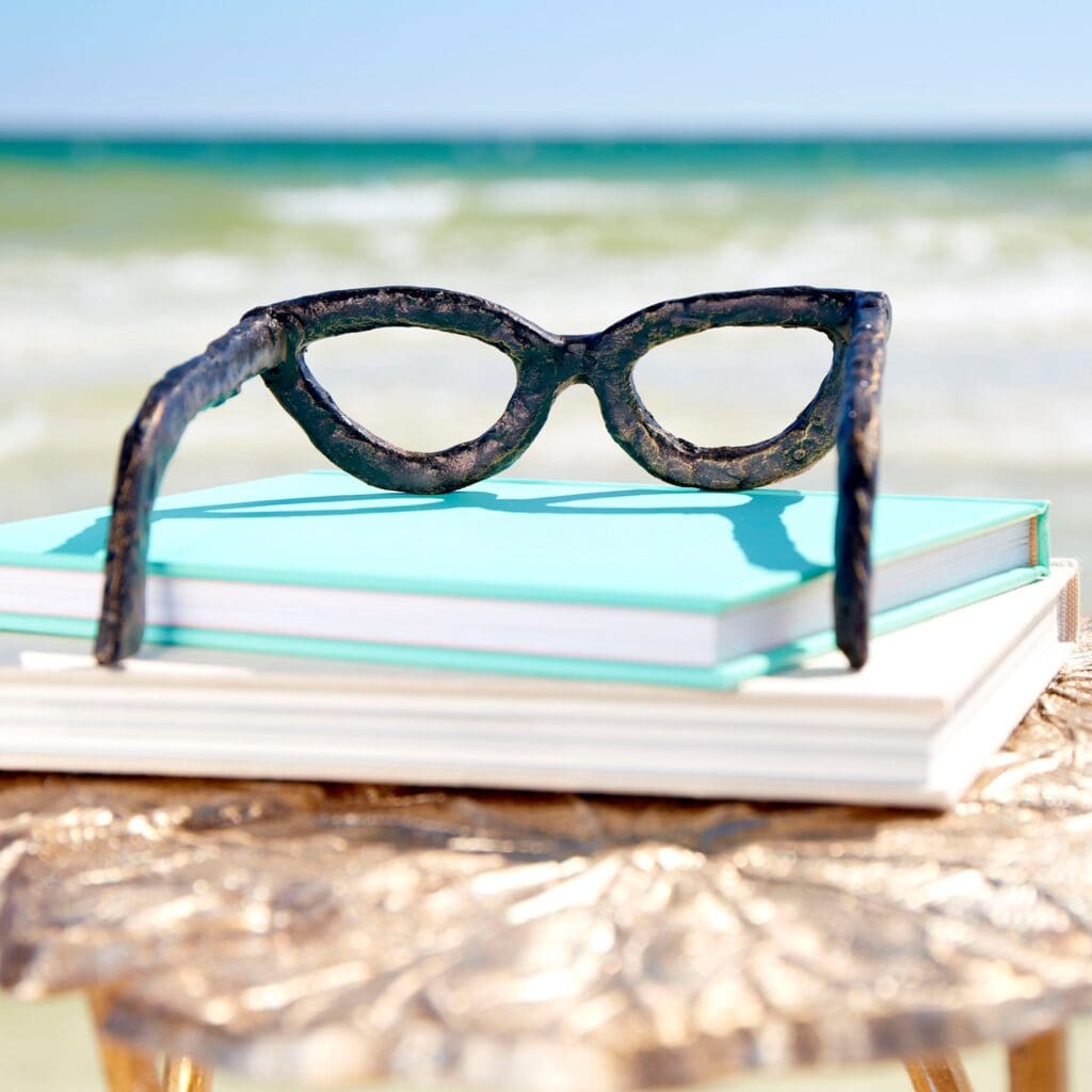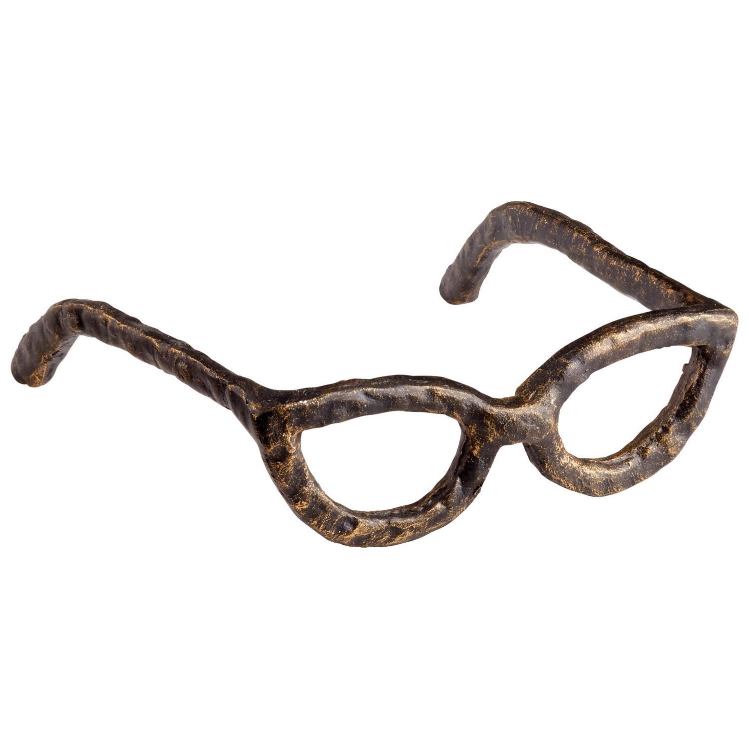 A pair of glasses crafted in a metal sculpture add character and charm to a bookcase or desktop. In an old world finish over iron construction, the sculpture perfectly emulates a pair of reading glasses.