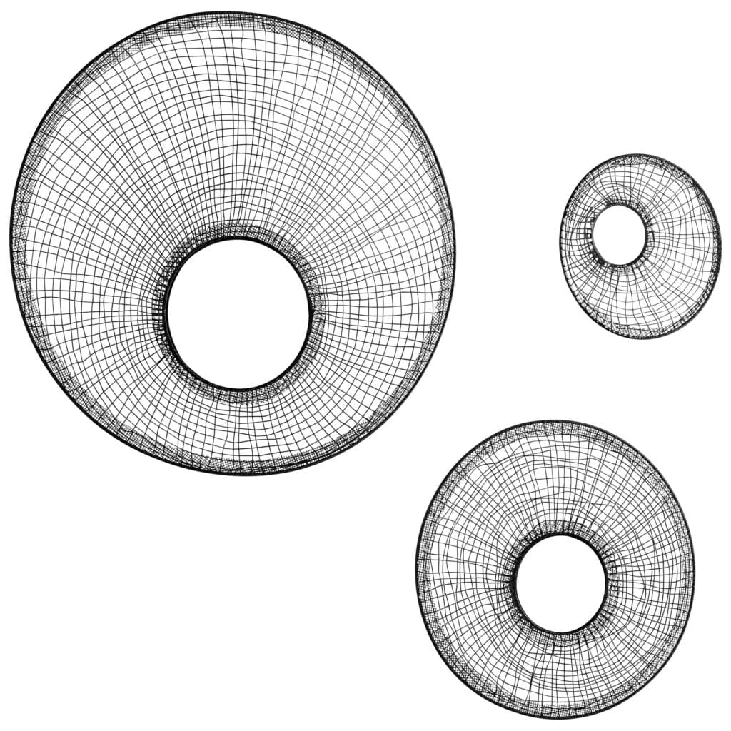 This trio of wall mirrors feature modern crosshatched metal frames in a round graphite finish. The iron metal has wires that are interwoven into one large circle with the reflective glass centered perfectly to provide absolute symmetry. These gorgeous mirrors make an impressive statement showcased together or work just as well hung individually in any home or commercial space.