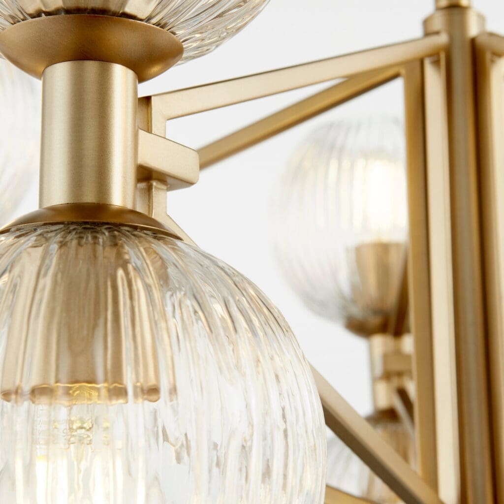 Luxurious and stunning, the modern Helios chandelier is characterized by its perfectly angled, aged brass frame and its dual, up-light/down-light sockets. With bulbs neatly housed in clear, ribbed glass orb shades for an added touch of whimsy. The overall composition is futuristic and leans mid-century modern in its styling. This striking luminary comes together harmoniously in its eye-catching geometry and luxury appeal. Hang it over any dining room table, in any entryway foyer, or living room space as a captivating and functional centerpiece.