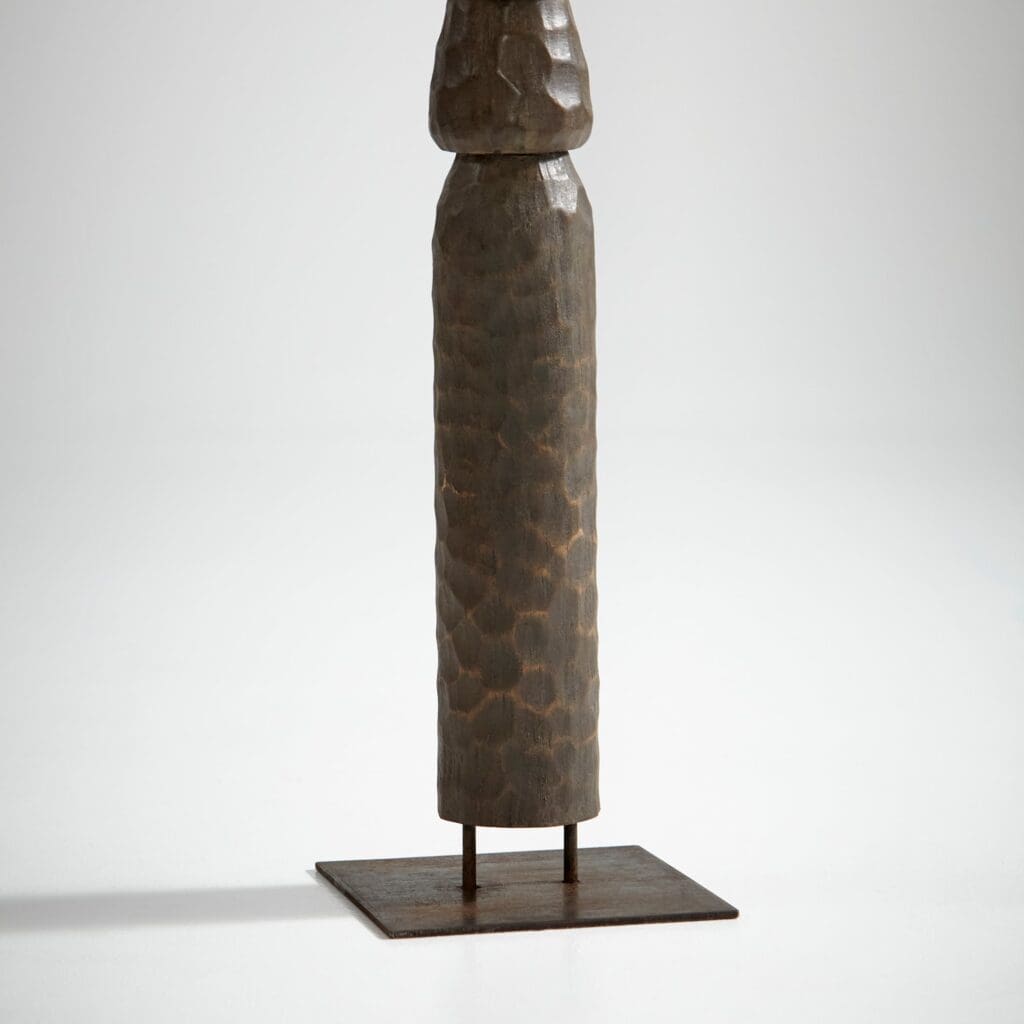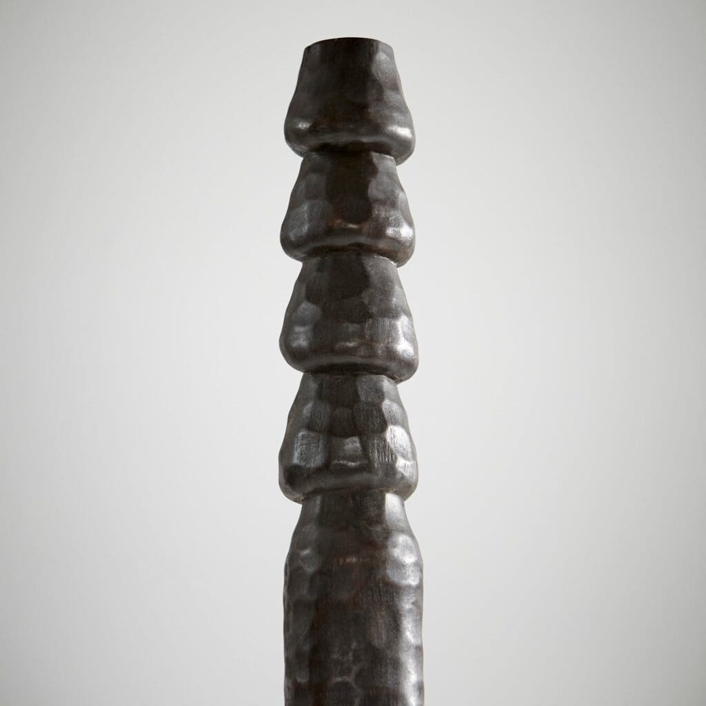 The Kinsey sculpture boasts a unique ridged design on a cylindrical frame, coated in a slate black finish. A rectangular iron base helps balance the statue wherever it is placed. This abstract accessory is the perfect choice for any minimalist, modern, or transitional setting. Available in three size options, making it a great addition to any commercial or residential design plan, as a standalone or a trio for a more impactful display.
