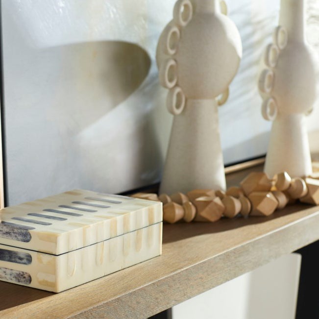 The overly simplistic design of the Chai Beads highlights the beauty and significance of the geometric shapes. Its structured patterning and 3-D dynamic is ideal as a center-piece or decorative filler. This piece is an excellent addition to other objects made from natural materials or is a great juxtaposition to glass or metal objects. Perfect for placing on tables, bookshelves, bowls, shelves, and trays.