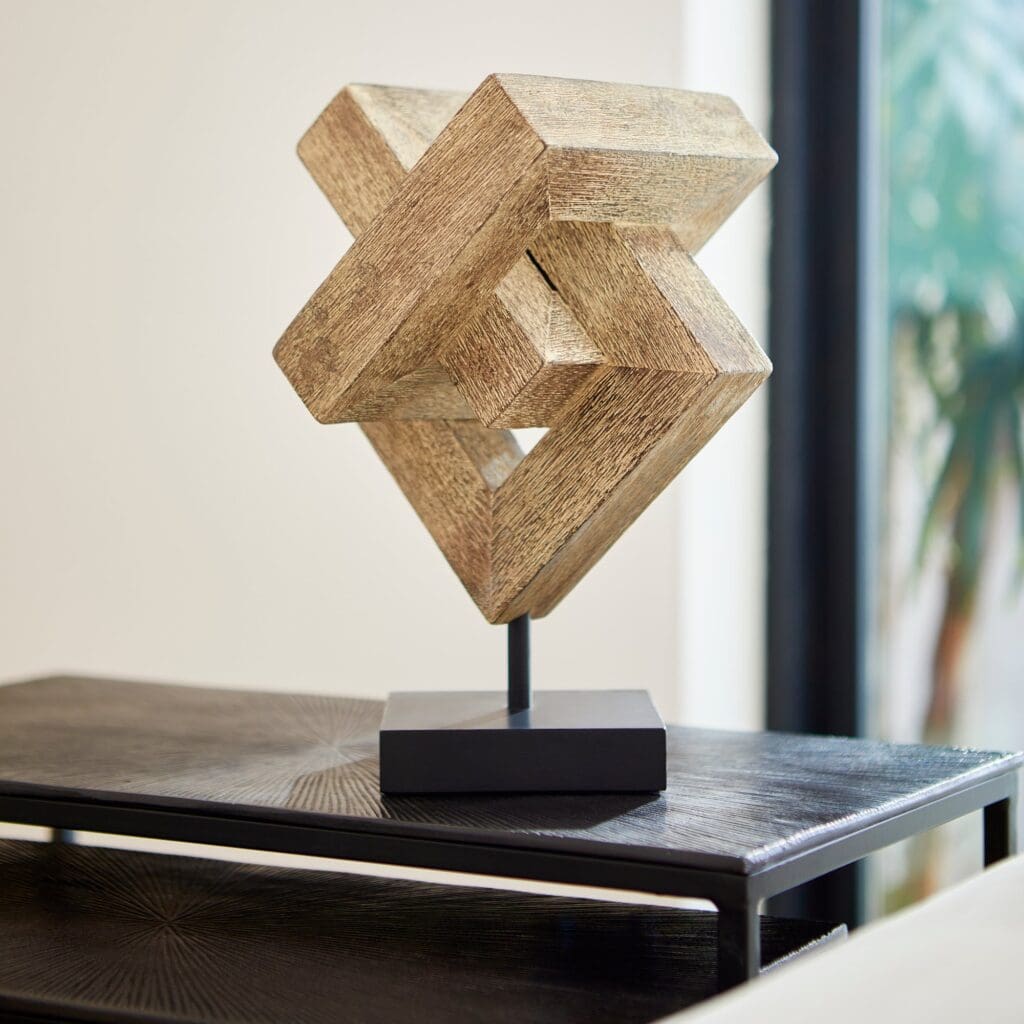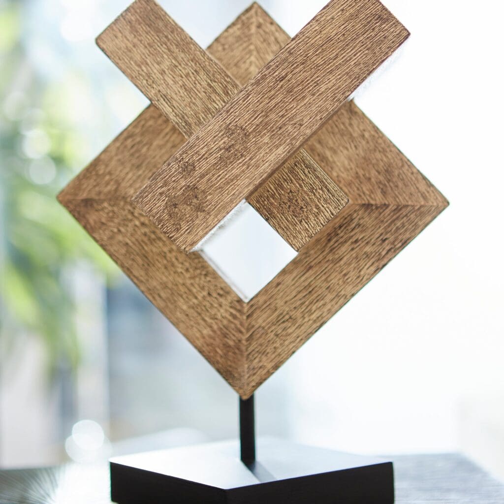 This is a bewildering floor standing sculpture that boasts an attractive natural wood grain that is certain to stun any and all that behold it. Its design is derived from the classic gestalt artistry and is a fitting inclusion to your home decor. This artful geometric looping design can instantly give any living room, entry way, dining room or office a stylish, natural artistic element. This neutral accent will easily complement any of your existing decorative accessories, but it will stand out from the rest.