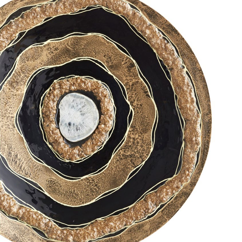 This is a circular structure that features many fine details and texture. Its speckled coating gives slight pops of light to the dark surface with a center stone highlighted in the middle. This piece has many details that elevate its artistic appeal and is perfect for elevating style in living rooms, offices, commercial, and residential spaces. This wall art can also be paired with many different decor styles.