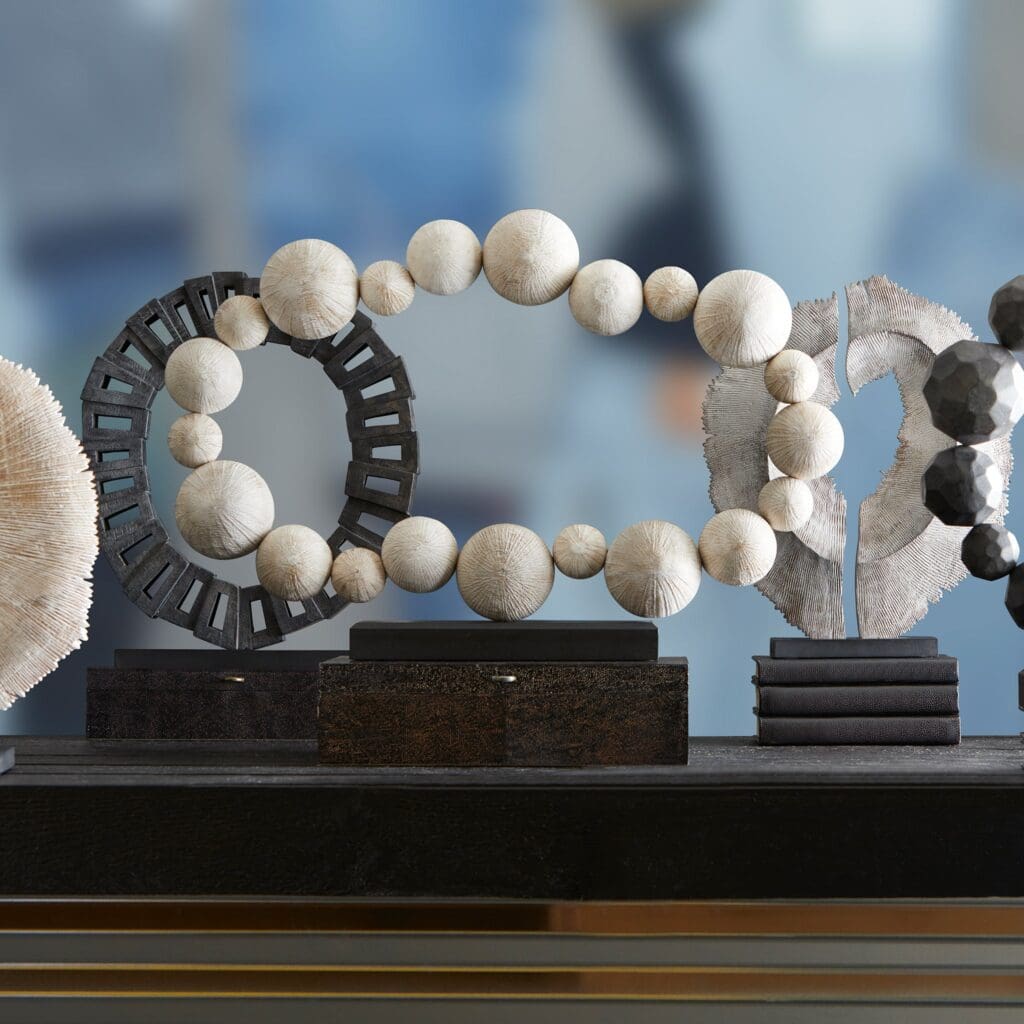 The chiseled spheres of the Garnet sculpture connect to form a circle perched atop a solid wood base. Made from Ardu wood and bearing a white washed finish, the sculpture serves as an enchanting addition to any setting. By displaying the Garnet sculpture, you are sure to fascinate your guests with its simplistic charm.
