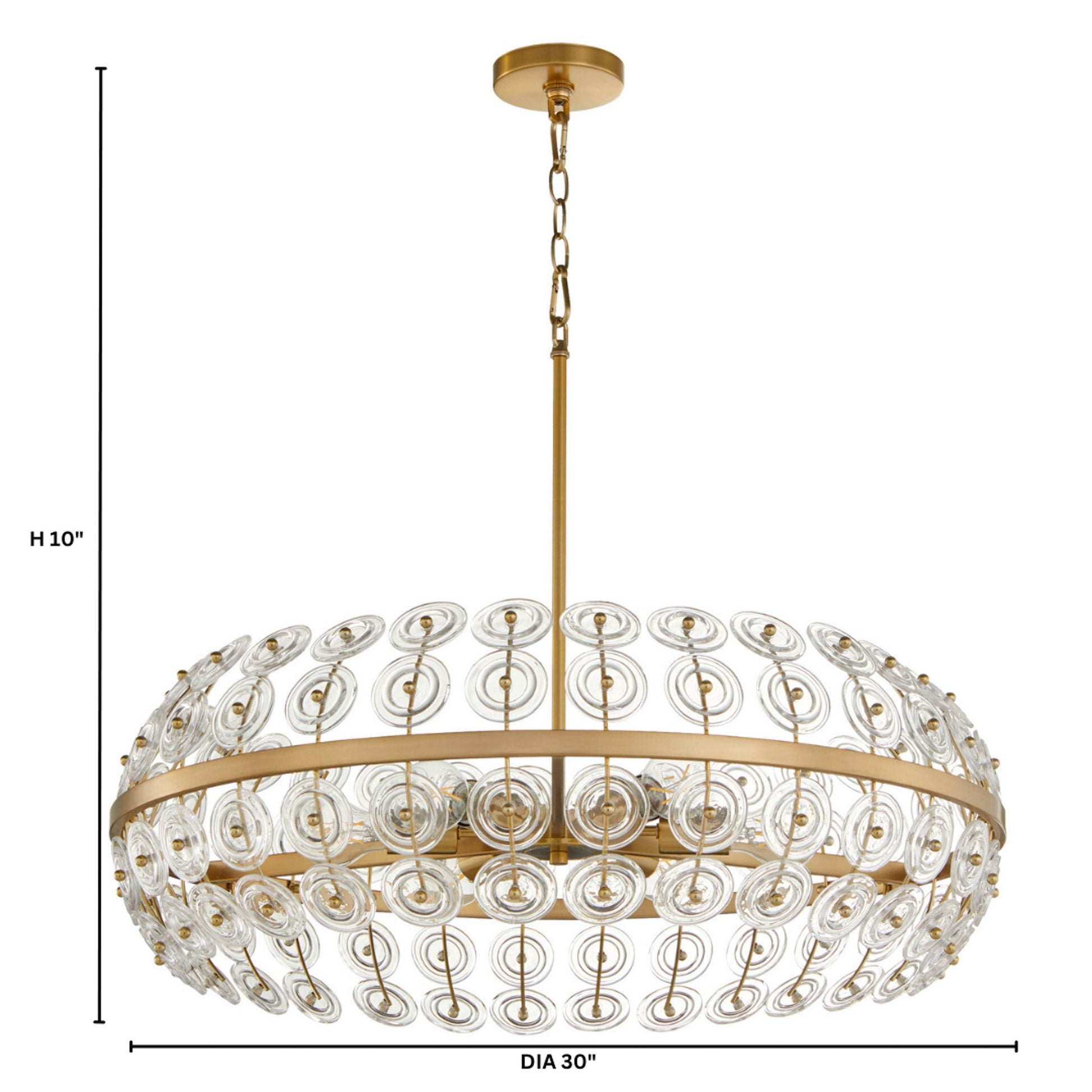 The Selena series of designer lighting is noted for its molded glass disks and elegant aged brass frames. The shade is cylindrical, with one circular horizontal band with several vertical rods connected reminiscent of a dandelion. Each rod holds a series of clear, concentric, circular molded glass disks with an antiqued ripple design. The medium base sockets are positioned inside the frame, casting a warm glow through the glass discs. The series hangs from a chain attached to a circular canopy.
