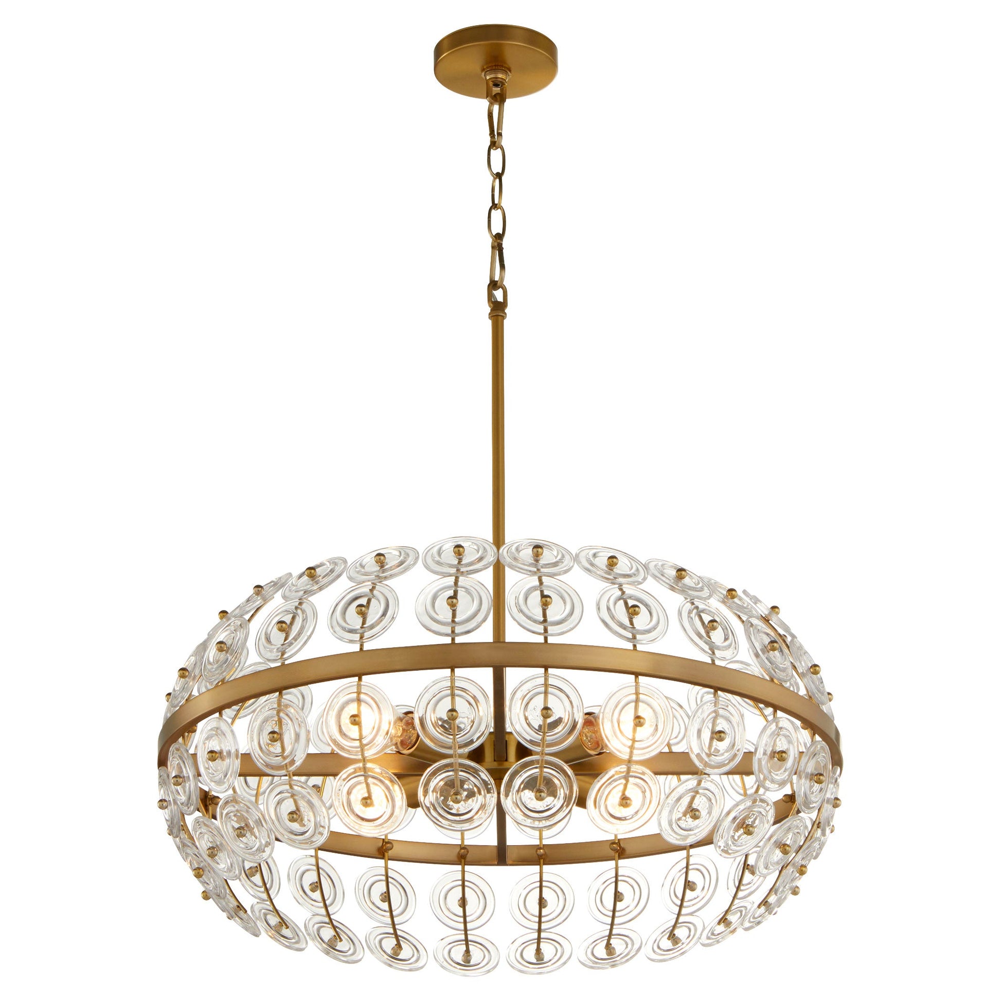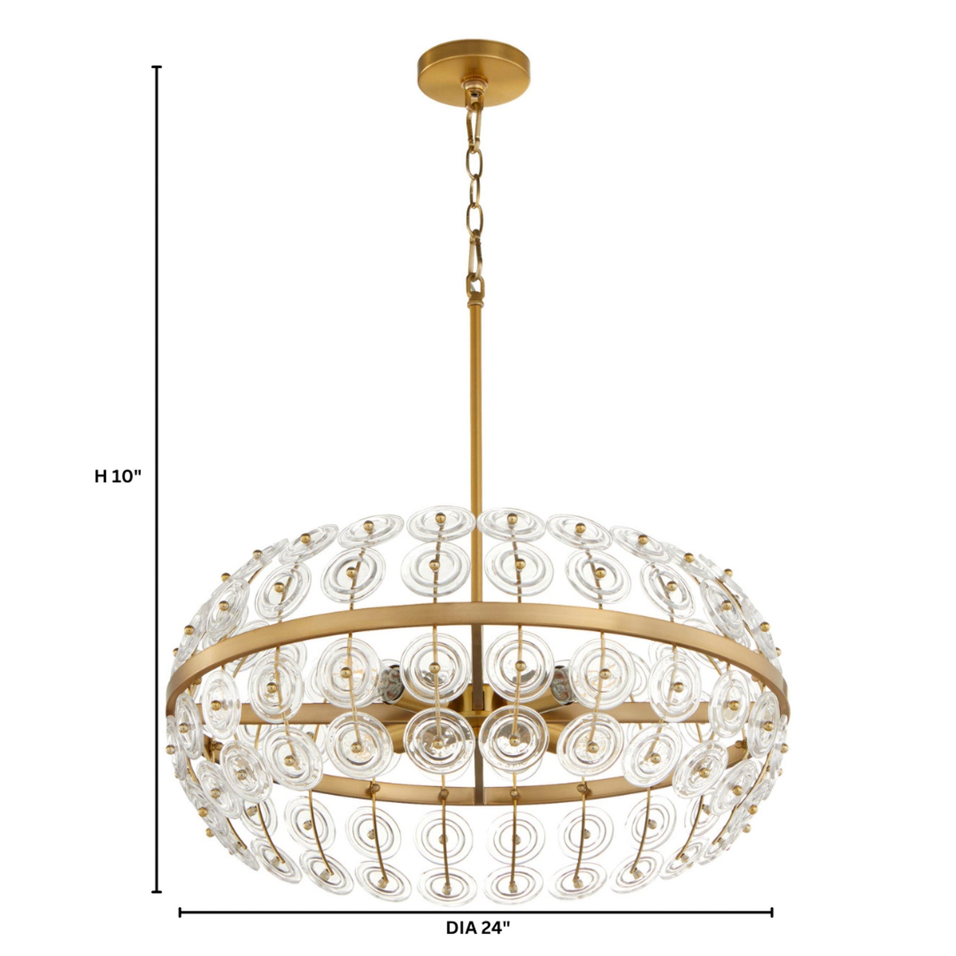 The Selena series of designer lighting is noted for its molded glass disks and elegant aged brass frame. The shade is cylindrical, featuring one circular horizontal band with several vertical rods reminiscent of a dandelion. Each rod holds a series of clear, concentric, circular molded glass disks with an antiqued ripple design. The medium base sockets are positioned inside the frame, casting a warm glow through the glass discs. The series hangs from a chain attached to a circular canopy.