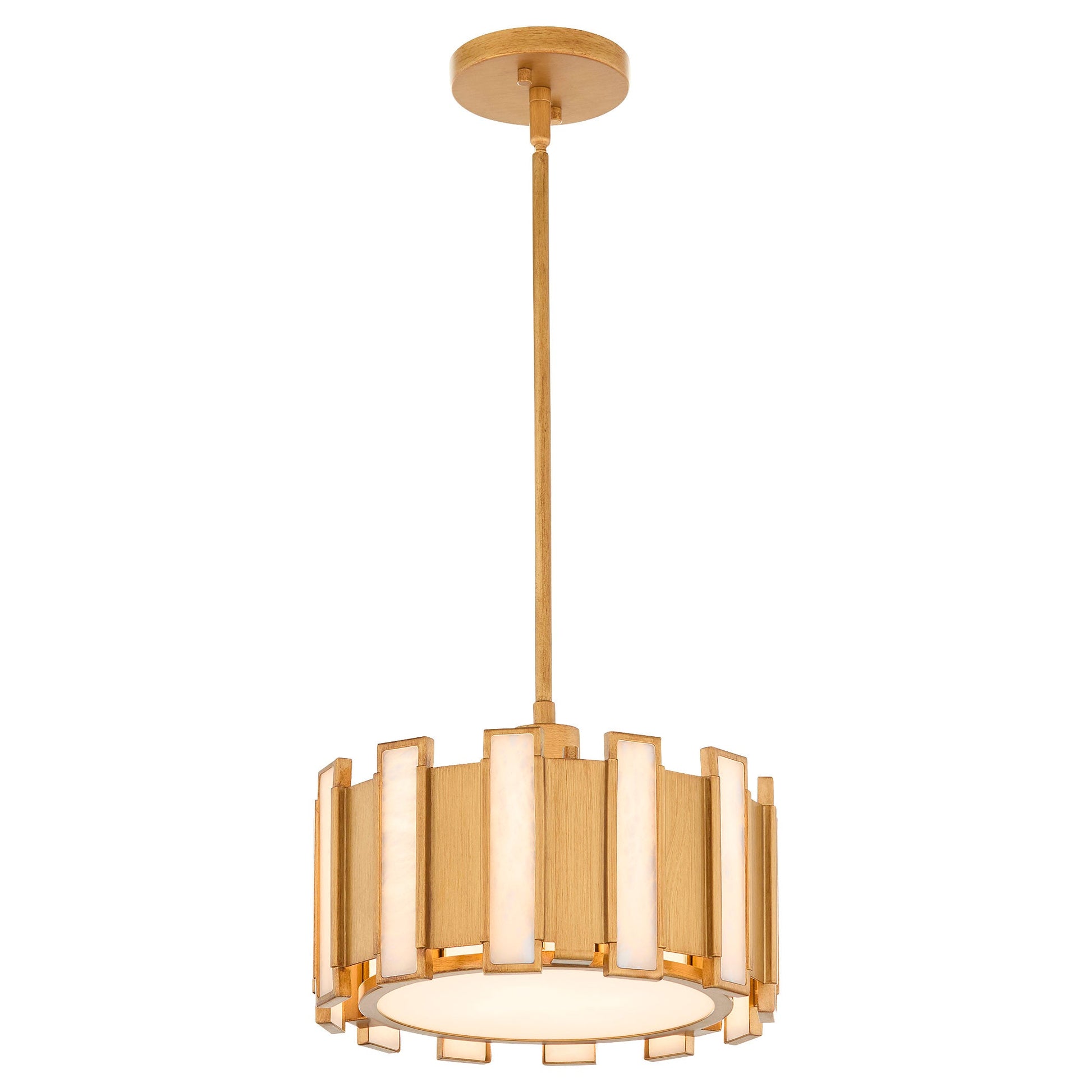 The Volterra collection comprises alternating short, aged brass and tall, framed alabaster glass rectangles that meet around medium base sockets to form a cylindrical shade. Concealed within, the lamps cast a soft glow through a round frosted glass diffuser secured to the light by an aged brass frame. Add mid-century, empire style with the Volterra collection of designer lighting to your next interior design project.