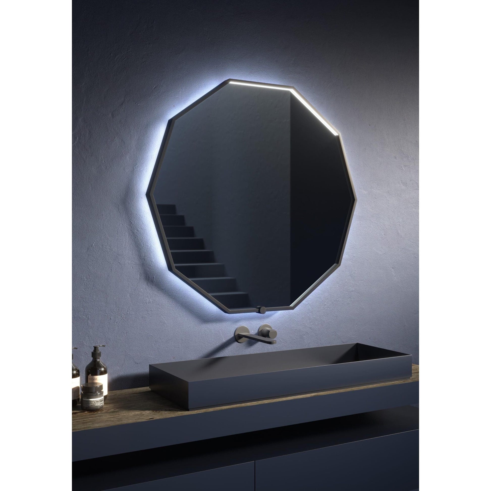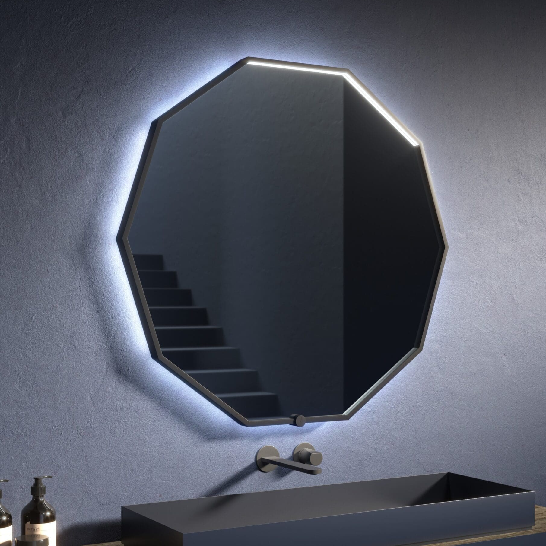 Introducing the Oxygen Deca LED Lighted Mirror - an Italian masterpiece that blends exquisite design and cutting-edge technology to redefine your daily beauty experience. Designed in Italy, the Deca Lighted Mirror boasts a one-of-a-kind 10-sided matte black shape, making it a stunning focal point in any room. Our exclusive GHOST Frame Lighting technology conceals the light source within the frame when switched off, creating a mirror that’s functional and a work of art. The Deca mirror transforms into an elegant home decor piece when the integrated LED lighting is switched off. Say goodbye to foggy mirrors with the defogger and enjoy a pristine reflection, even in the steamiest bathroom conditions. With CCT selectability, you can toggle between different light temperatures to suit your mood and grooming needs. What truly sets the Deca apart are the three unique light settings activated by a simple touch of a button: one touch and the user illuminates the top three sections of the GHOST frame lighting and the ambient backlighting; a second touch and all ten areas of the GHOST frame lighting are activated; a third touch and the GHOST frame lighting disappears, but ambient backlighting remains. Operate the Deca Lighted Mirror easily using the touch sensor discreetly located at the bottom of the mirror and adjust settings or turn the mirror on or off. Elevate your self-care rituals, revel in the spacious reflection, and redefine your space with Deca – where design meets functionality in perfect harmony.