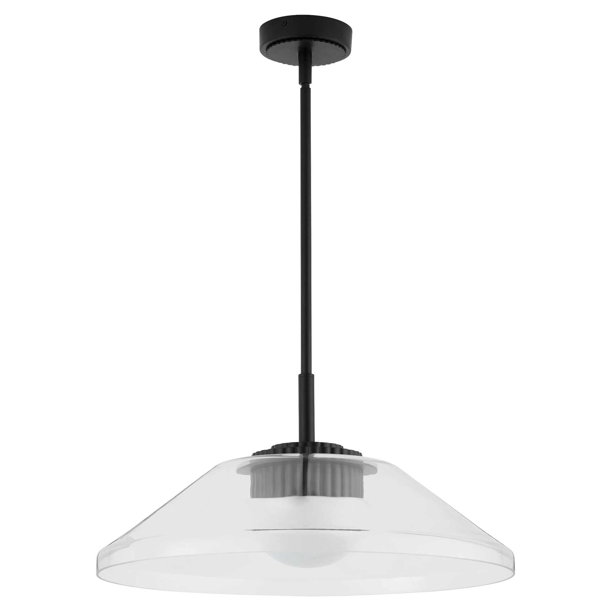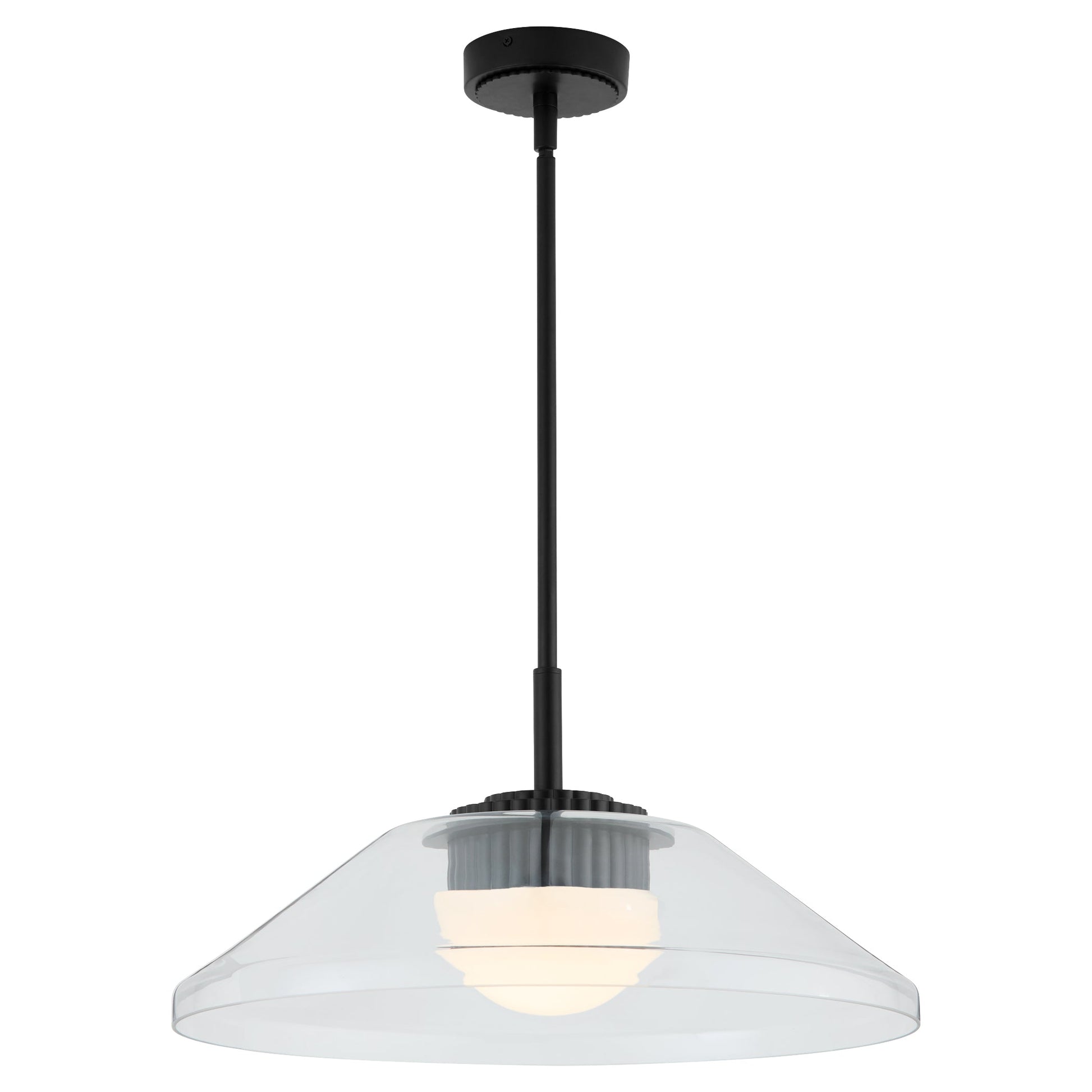 Eros redefines the industrial shade light with a modern, decorative twist. Its clear glass shade highlights fluted body details reminiscent of a heat-sinking collet, while the sleek half-globe diffuser completes its industrial chic design. Perfect for adding bold character over a kitchen island, dining table, or workspace.