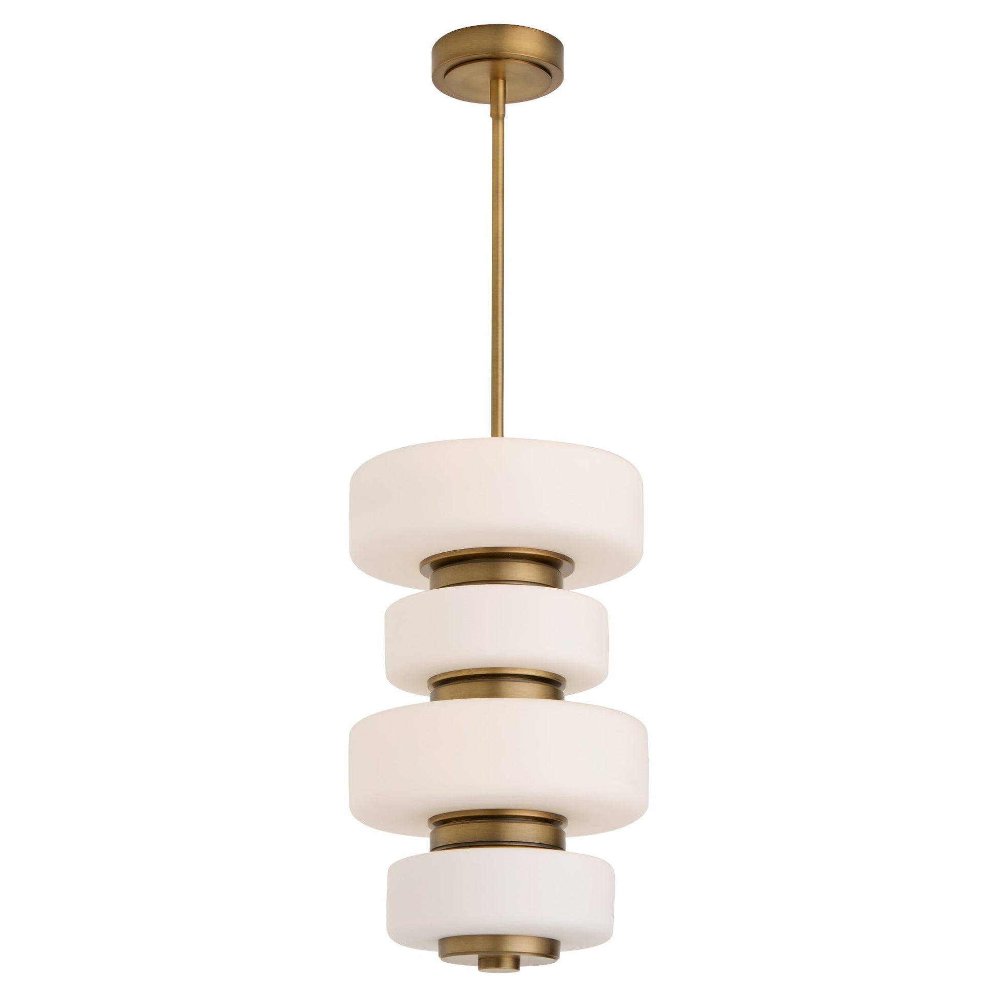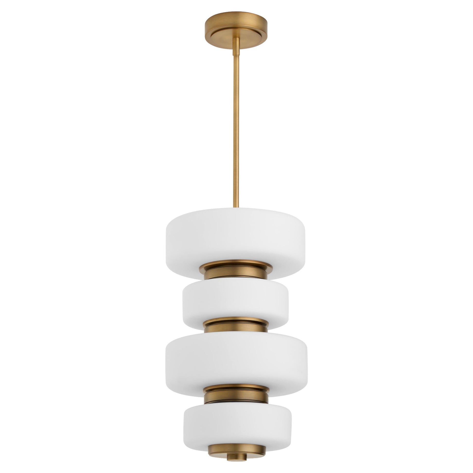 The Oxygen Lighting Favo 3-81-56 Pendant is UL Damp Rated and finished in Brushed Brass. It features a 30 Watt LED Array (MPN: 3-81-56 Favo) that exemplifies a blend of traditional Japanese architecture with Art Deco design elements. The light is softened by satin opal glass, creating a stately presence that elevates the elegance of any space.