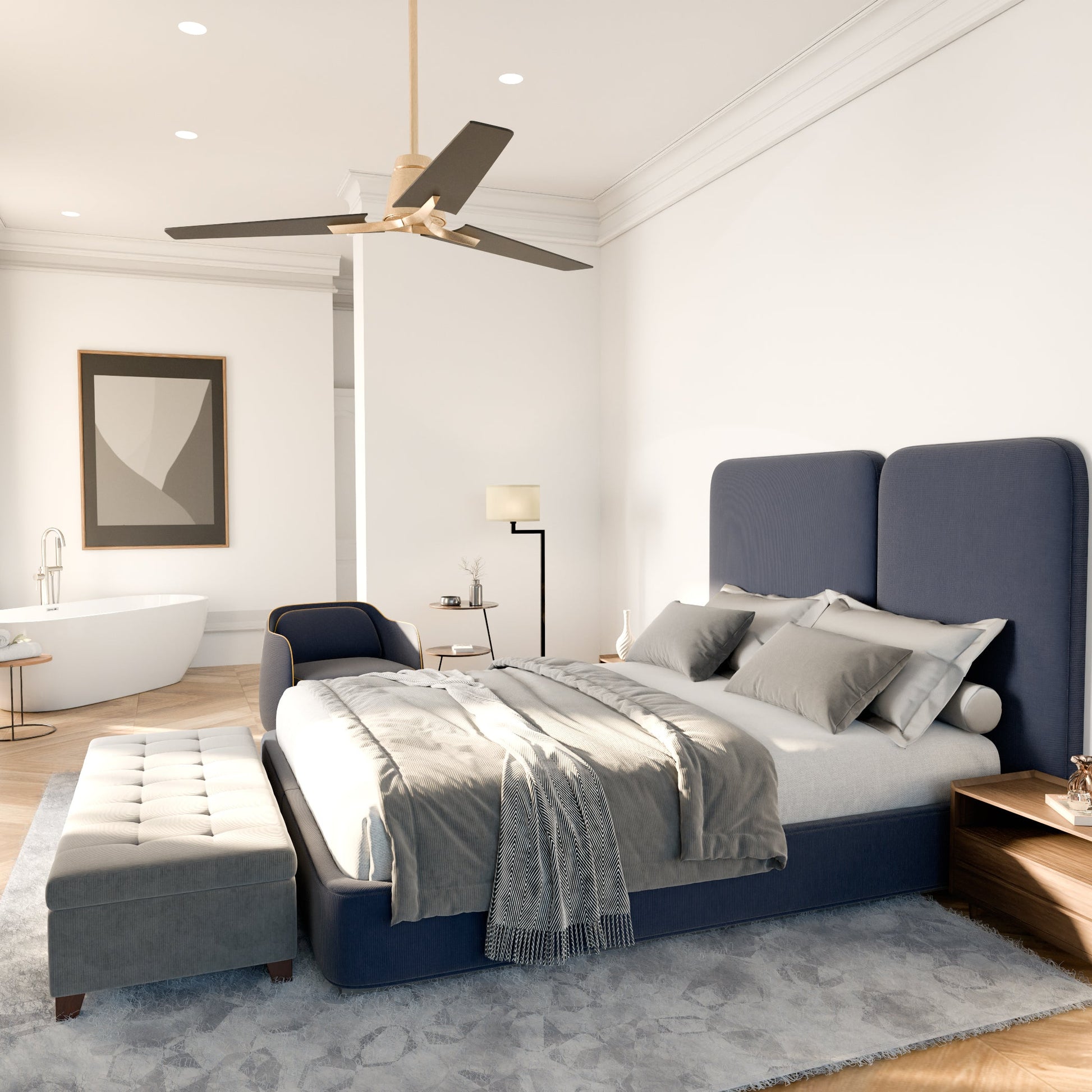 The Halcyon ceiling fan features a streamlined aesthetic characterized by three elongated wooden blades. The central motor housing and mounting hardware add a modern and industrial feel. A signature gap between the tilted blades and motor housing creates visual movement while retaining the cohesive look of the fixture.