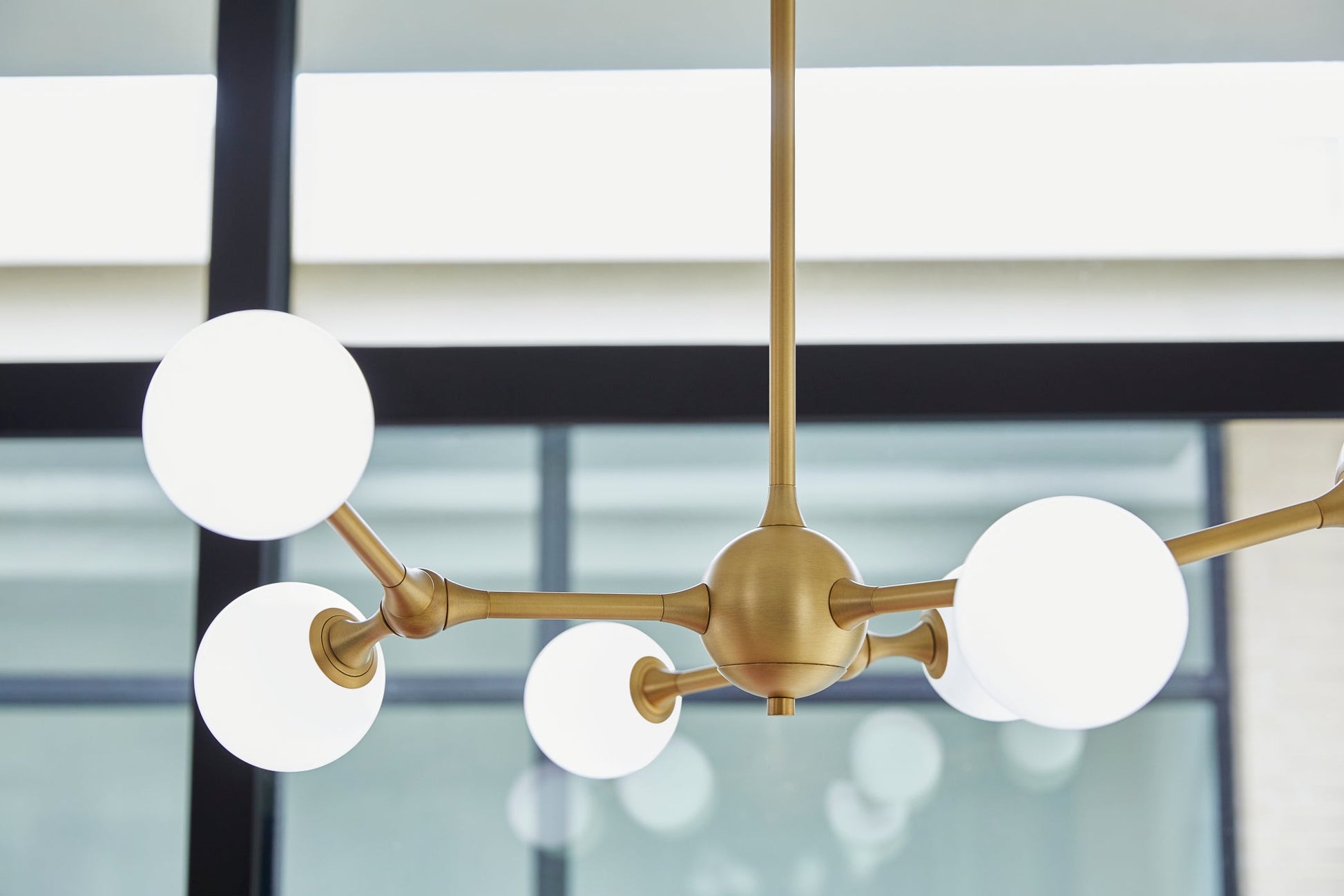 Oxygen Lighting Orbe 3-646-56, Chandelier, UL Damp Rated, Brushed Brass. Rooted in the wonder of constellations, Orbe shines with a celestial elegance. Its whirling arms, each capped with round glass bulbs, create a sense of movement and balance—like an abstract night sky. With chandelier and sconce options, Orbe brings drama and intrigue to modern and transitional spaces, allowing for a harmonious design to come to life.
