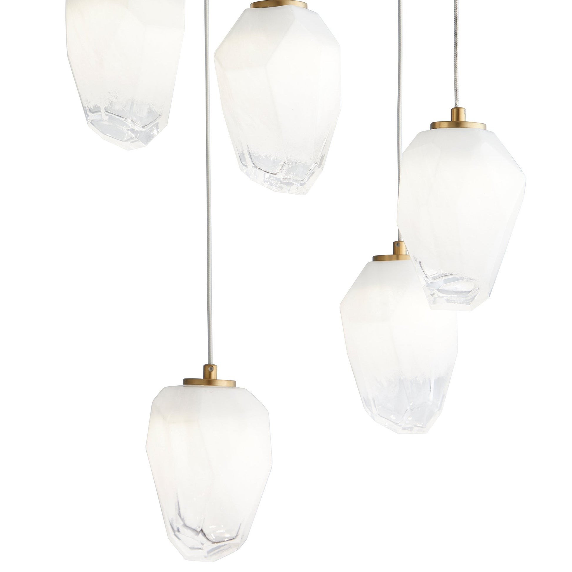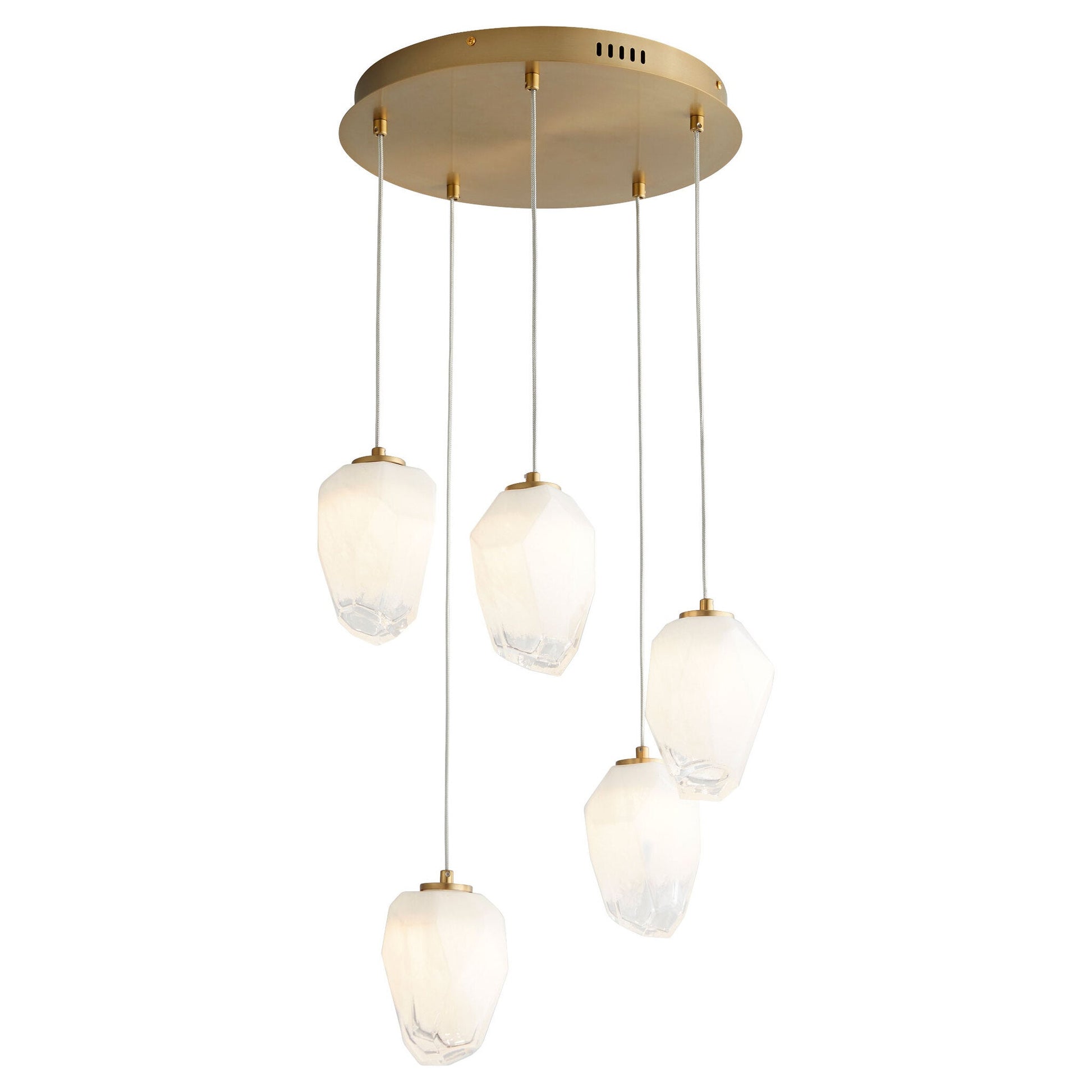 Oxygen Vivo 3-810-40 Pendant - Aged Brass. Faceted blown glass diffusers inspired by rock crystal provide a stunning display in the Oxygen Vivo LED lighting series. Five lights at staggering heights illuminate from 8-watt 90 CRI LED arrays with 3000/3500/4000k CCT capabilities. TRIAC and ELV dimming at 120V AC, Five 8 Watt LED 90CRI CCT. Oxygen Lighting Vivo Item Number 3-810-40
