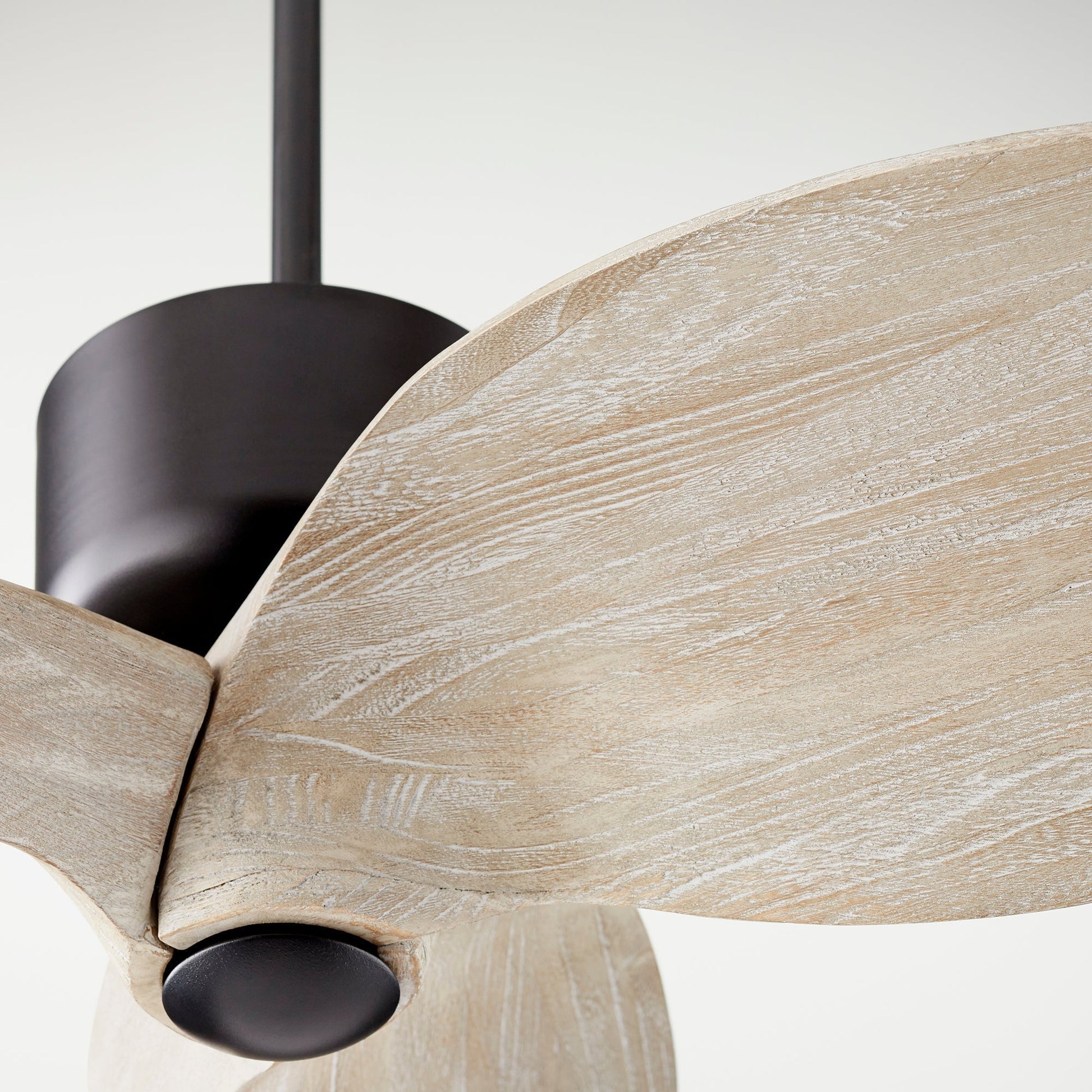 Quorum Hawkeye 31523-69 Ceiling Fan - Textured Black Hawkeye 52" 3 Blade Fan - NR. The Hawkeye fan combines the best of both worlds with its modern form and classic, distressed finish. The blade sweep extends 52 inches at a 45 degree pitch. Each blade boasts a Weathered Oak finish for that quintessential rustic look. The motor frame sports a nice contrasting Noir finish. This contemporary three blade design features graceful curves that provide a breezy airflow perfect for any boho-chic, eclectic, or modern farmhouse space. Quorum International MPN: 31523-69