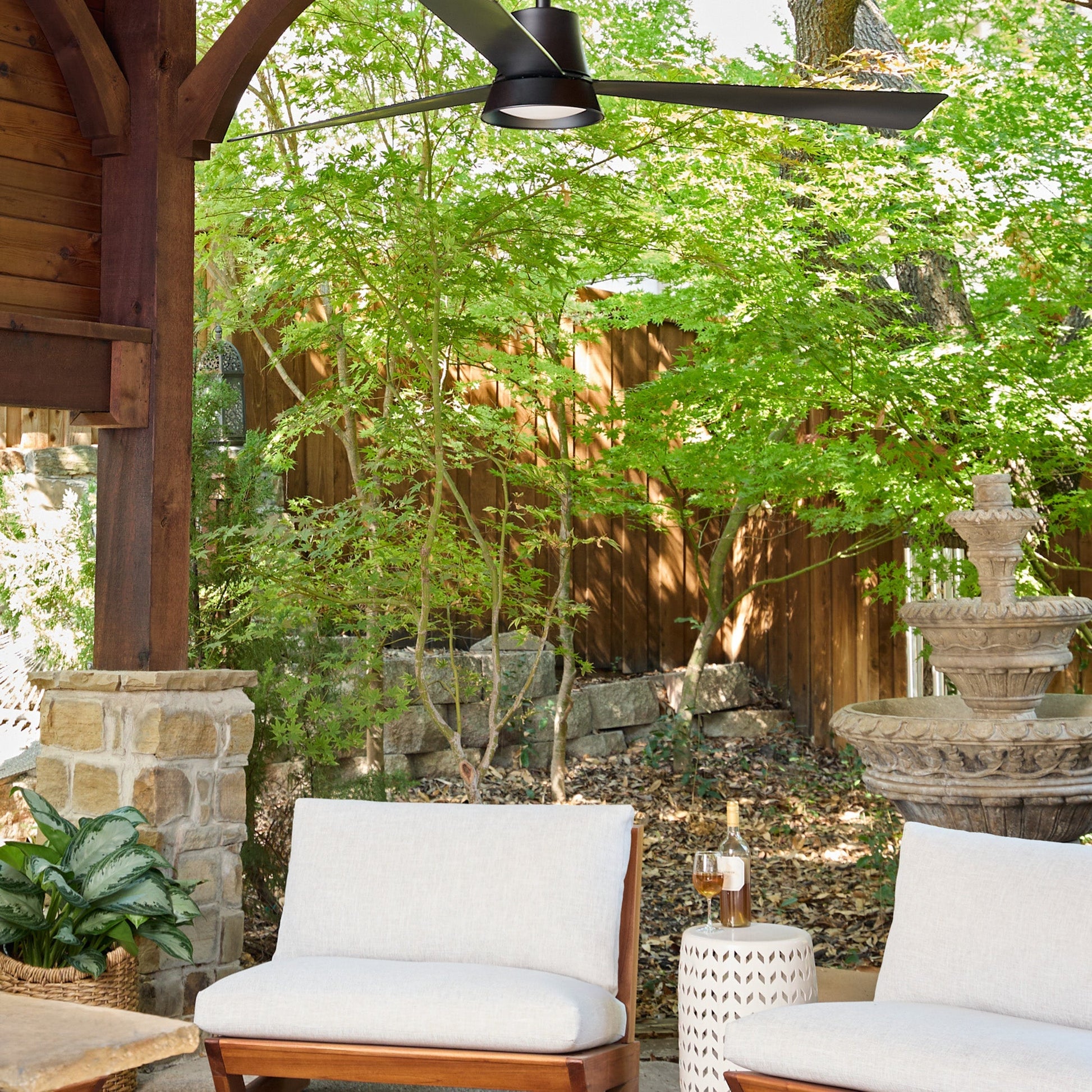 Introducing the Quorum Esquire 15583-59 Patio Fan, designed for damp environments and finished in a sleek matte black. This fan is UL wet rated, making it perfect for outdoor spaces. Its modern design complements a variety of patio aesthetics.
